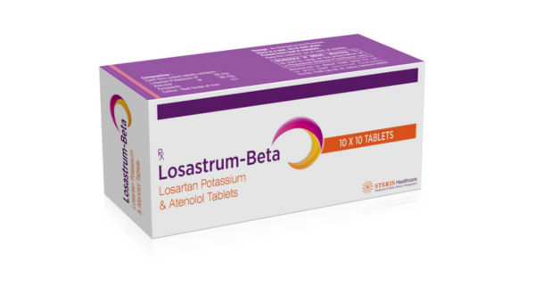 LOSASTRUM BETA is a clinically formulated combination therapy containing Losartan 50 mg and Atenolol 50 mg, designed to effectively manage high blood pressure and support overall cardiovascular health. Losartan is an angiotensin II receptor blocker (ARB) that helps relax blood vessels, while Atenolol is a beta-blocker that reduces heart rate and cardiac workload. Together, they provide a synergistic effect to maintain optimal blood pressure and protect the heart from hypertensive complications.