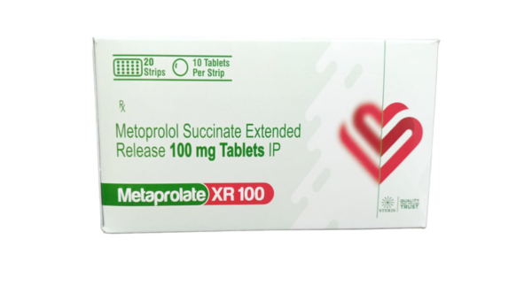 METAPROLATE XR 100, containing Metoprolol Succinate Extended Release 100 mg, is an effective and reliable medication for the management of hypertension, angina, and other cardiovascular conditions. Its beta-blocker action, combined with an extended-release formulation, provides consistent 24-hour heart rate and blood pressure control, reduces cardiac workload, and lowers the risk of serious cardiovascular events. When taken as prescribed and combined with a heart-healthy lifestyle, METAPROLATE XR 100 can significantly improve heart function and overall cardiovascular well-being. Always follow your healthcare provider’s guidance to ensure safe and optimal treatment outcomes.