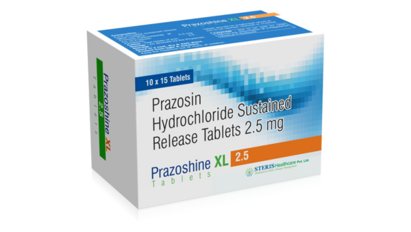 Prazosin SR 2.5 mg is the active ingredient in PRAZOSHINE XL 2.5, a sustained-release (SR) drug that is frequently used to treat hypertension and other heart-related disorders. Alpha-1 adrenergic blockers, of which prazosin is a member, relax blood arteries and enhance blood flow. Long-lasting therapeutic benefits and increased patient compliance are provided by the sustained-release formulation, which guarantees progressive absorption. Healthcare providers frequently suggest PRAZOSHINE XL 2.5 because of its shown effectiveness and tolerability when taken as prescribed.